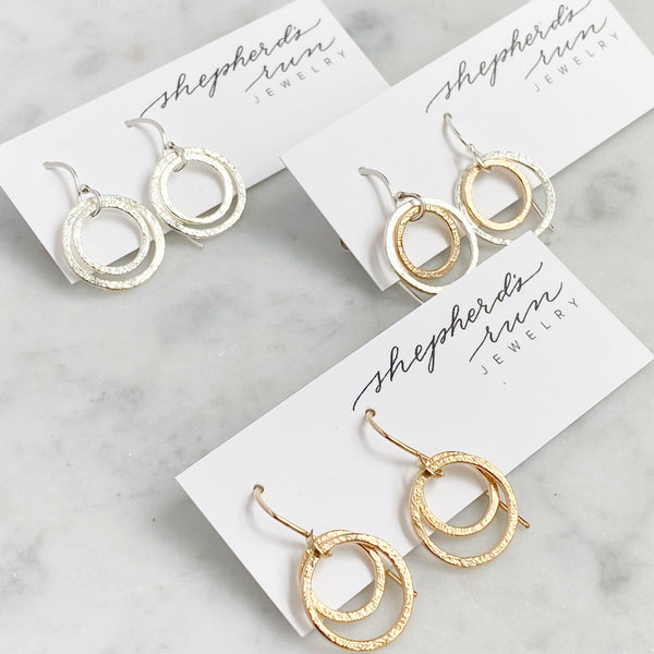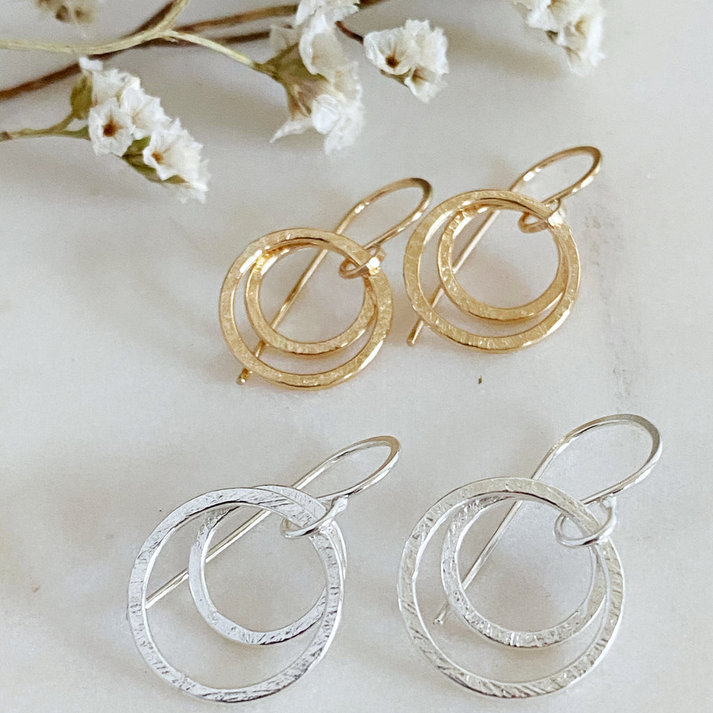 The simplest of little hoops for your everyday wear! Two little hand hammered hoops quietly sit and give you a perfect accent for running errands or writing your next big deal. These easy to wear petite drops keep you good company through whatever your day brings.